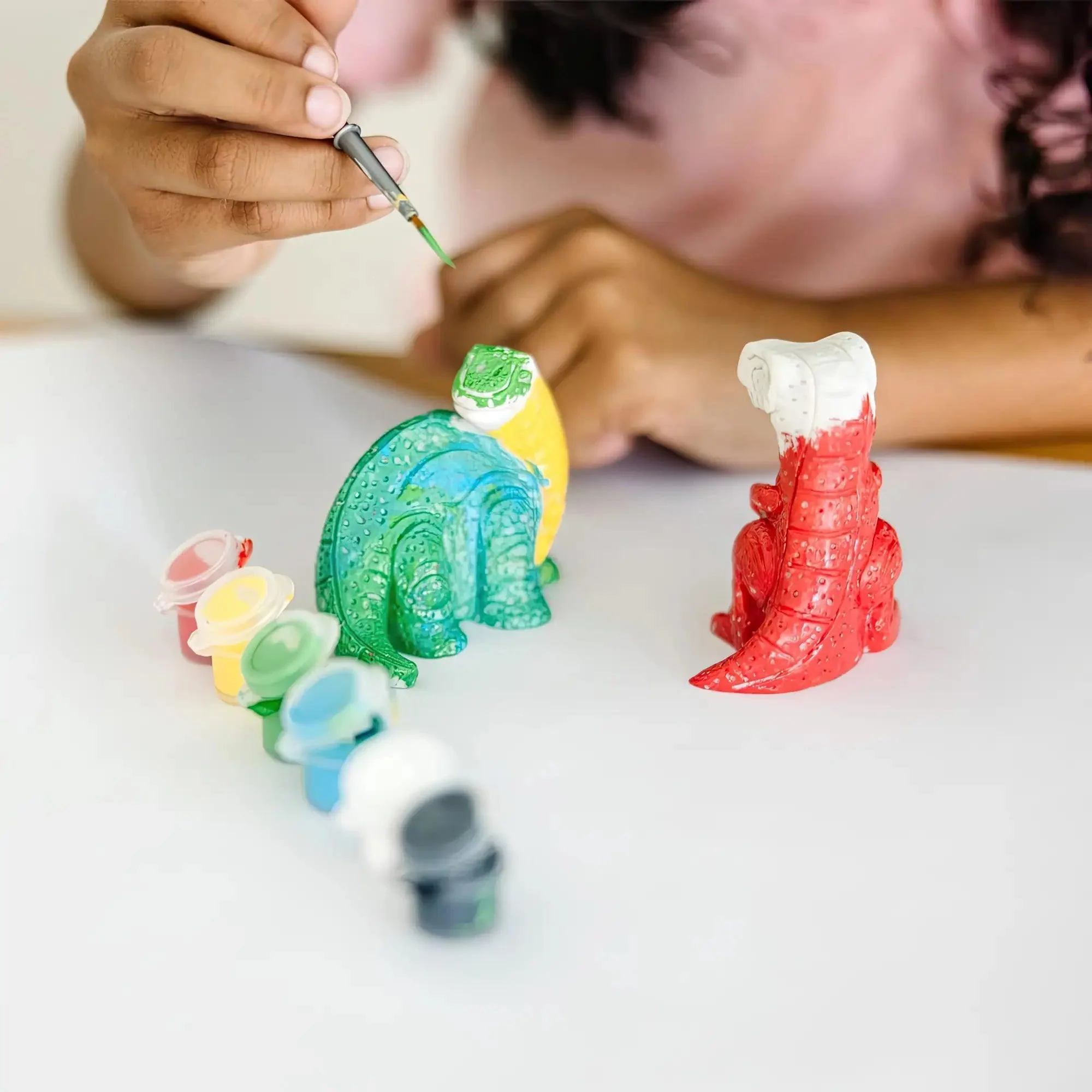 - READY-TO-DECORATE DINOSAURS: The Melissa & Doug Decorate Your Own Dinosaur Figurines set comes with two ready-to-decorate dinosaurs, six pots of paint, and paintbrushes. The figurines measure 2 inches and 4 inches.
