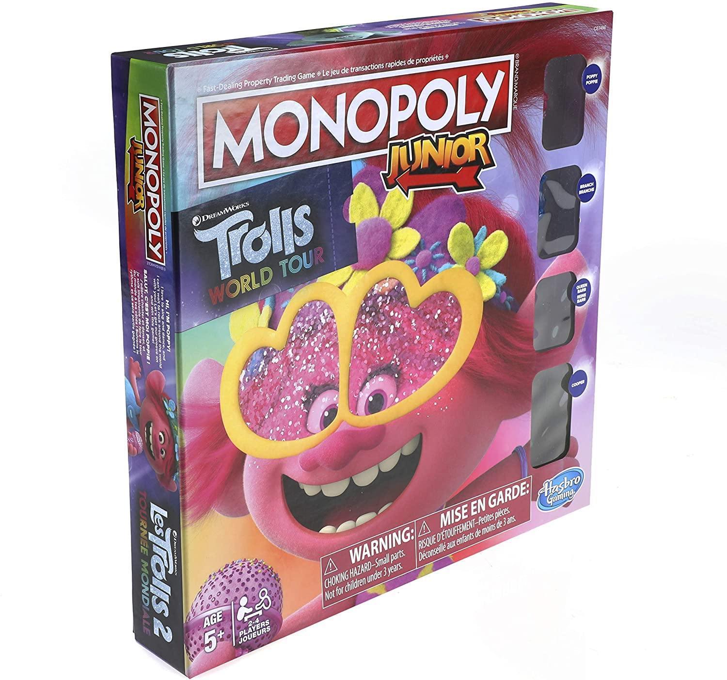 - MONOPOLY GAME: DREAMWORKS TROLLS WORLD TOUR EDITION: In this Monopoly Junior game, kids can imagine joining Poppy and other Trolls characters in their adventures through the Troll World